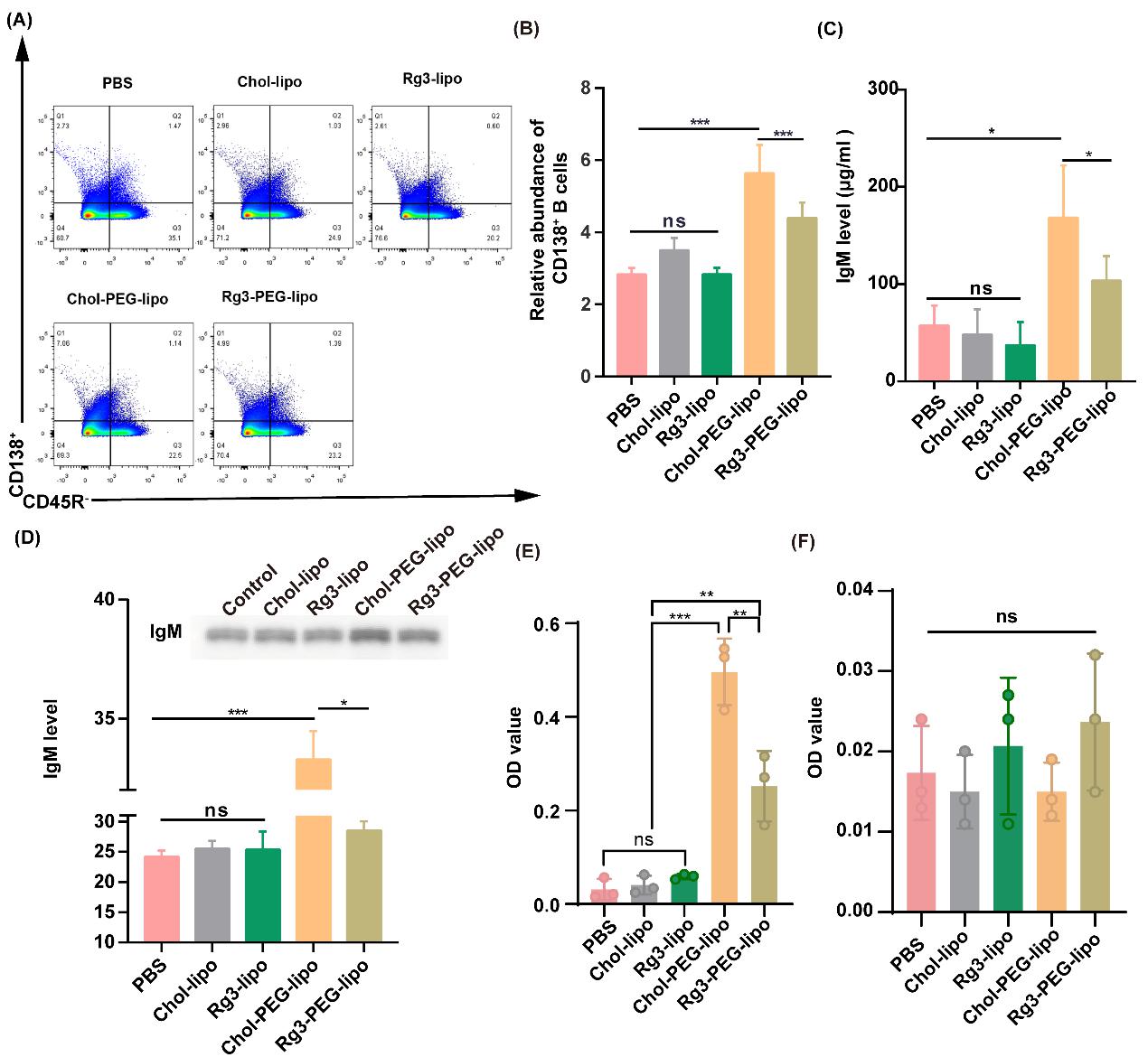 To elucidate the mechanism by which Rg3-lipo avoids the ABC effect, the researchers further investigated the immunogenicity of Rg3-lipo. It was found that injection of Chol-PEG-lipo induced rapid activation of B cells into plasma cells, leading to the secretion of large amounts of anti-PEG IgM. This process mediated the rapid recognition and clearance of subsequent injections of Chol-PEG-lipo. In contrast, Rg3, as a small molecule with low immunogenicity, did not induce B cell activation or the secretion of anti-Rg3 IgM. Therefore, the body did not recognize and clear subsequent injections of Rg3-lipo (Figure 5).