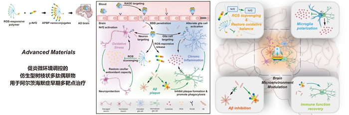 Due to the complexity of brain diseases, researchers have gradually realized that changes in the microenvironment of brain lesions have important guiding significance for the treatment of brain diseases. The early AD microenvironment is characterized by inflammatory responses and oxidative stress, which were reported to precede the appearance of the amyloid cascade. On the one hand, as the innate immune cells in the brain, microglia are of great significance for maintaining the metabolism and immune balance in the brain. Therefore, microglia can be treated as the core of modulation in the early stage of AD. On the other hand, continuously activated glial cells lead to the excessive production of reactive oxygen species (ROS) and further induce neuronal apoptosis. Thus, it is a feasible treatment to scavenge ROS accumulated in the microenvironment and restore the antioxidant capacity of nerve cells. Based on the characteristics of AD microenvironment, this study was designed and constructed a dendrimer-peptide nanoconjugate which could mimic the transport of Aβ in the brain to achieve multi-target modulation of microenvironment in the early stage of AD (Figure 1). The nanoconjugate could enter AD lesions efficiently, and scavenged ROS in the microenvironment through ROS-sensitive polymer materials. In addition, the conjugated peptide could activate nuclear factor E2-related factor 2 (Nrf2), thereby restoring the antioxidant capacity of damaged cells. Through the combined effects of the materials and peptide, this nanoconjugate could relieve oxidative stress fundamentally, reduce glial cell activation, polarize the transformation of M2 microglia, promote Aβ clearance, and finally realize the normalization of the microenvironment.The design ideas of this delivery system was verified in APP/PS1 transgenic mice and significant improvement of the cognitive function of AD model mice was achieved. This strategy provided a new perspective for AD treatment.