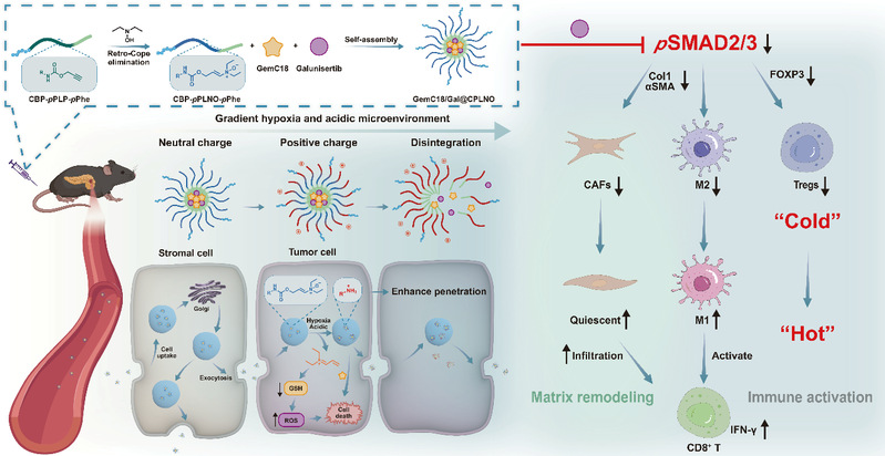 在胰腺导管腺癌(PDAC)中,基质细胞和基质蛋白形成了一道致密的物理屏障,这道屏障在阻止肿瘤细胞外侵的同时,也限制了药物和CD8+ T细胞的向肿瘤内渗透。此外,过度激活的TGF-β/SMAD信号通路进一步促进了基质增生和免疫抑制。因此,穿透基质屏障的同时保留基质完整性、在肿瘤内部释放药物、重塑基质以及激活免疫系统是一种有前景的药物递送策略。在本研究中,研究团队制备了一种烯胺N-氧化物修饰的纳米颗粒,其中包裹了硬脂酸修饰的吉西他滨前药(GemC18)和pSMAD2/3抑制剂galunisertib。纳米颗粒表面的烯胺N-氧化物可以触发转胞吞作用,随后响应缺氧和酸性微环境,将纳米颗粒表面电荷转变为正电荷,从而增强其穿透能力。释放的galunisertib可抑制TGF-β/SMAD信号通路,重塑基质,激活抗肿瘤免疫反应,并与吉西他滨(Gem)联合发挥杀伤肿瘤细胞的作用。相关成果以Transcytosis-Triggering Nanoparticles for Overcoming Stromal Barriers and Reversing Immunosuppression in Pancreatic Cancer Combinatorial Therapy为题,在线发表于国际知名期刊Nano Letters。