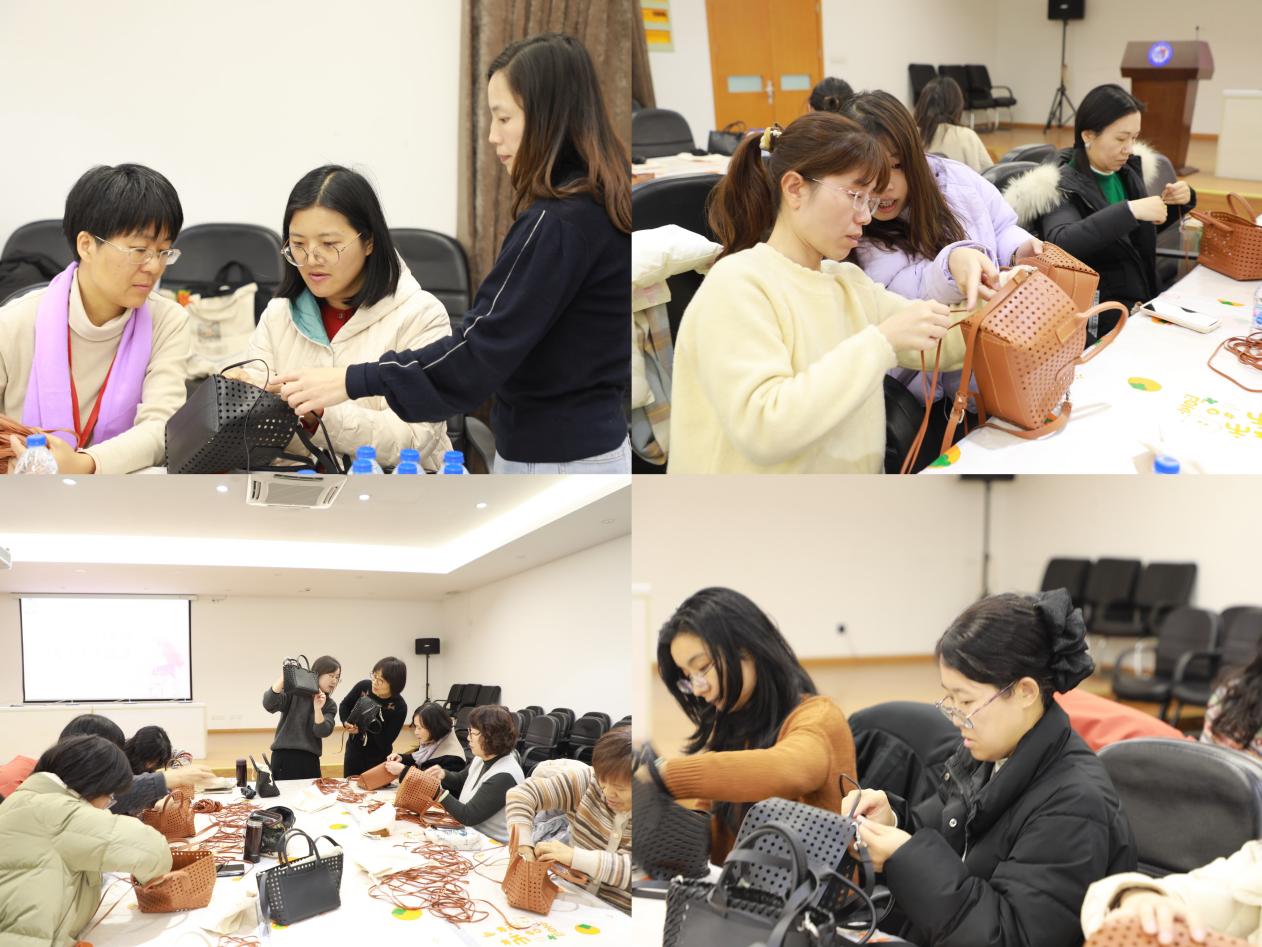 随后,手工老师向大家简要介绍了编织包的制作流程、所需材料和基本技巧。在老师的耐心讲解和示范下,女教职工们对编织包有了初步的了解,跃跃欲试,准备亲手制作属于自己的独特作品。有的老师手法娴熟,编织速度飞快;有的老师是初学者,她们一边听老师讲解,一边慢慢尝试;有的老师则是发挥创意,编织出独具特色的纹样。现场气氛温馨而热烈,大家互相帮助,交流心得,共同享受着手工制作的乐趣。