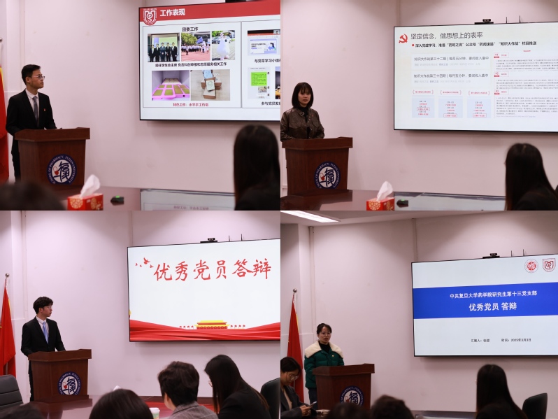 首先,14位优秀学生党员候选人依次进行了个人展示。候选人从理想信念、实践服务、科研学习、党员作用等方面对2024年度的表现进行了汇报与总结,充分体现了药院学子的风采和学生党员的先锋模范作用。展示结束后,几位老师针对候选人的汇报进行了提问和点评,勉励各位候选人要坚定理想信念,牢记初心使命,对标优秀党员标准,全方位提升个人综合素养,充分发挥党员的先锋模范作用。