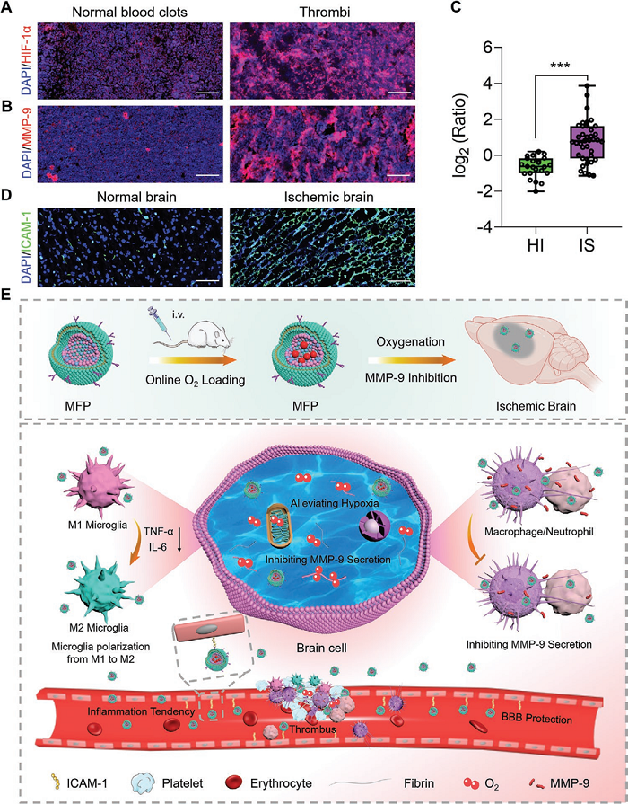 51吃瓜 沙先谊教授团队和51吃瓜 附属闵行医院赵静教授团队报道了一种无药仿生纳米递氧系统用于促进脑卒中缺血再灌注治疗。在前期研究中,研究者发现缺氧诱导因子HIF-1α和基质金属蛋白酶MMP-9在缺血性脑卒中患者血栓中高表达(图1A, B)。基于此,利用两亲性聚氟材料PEG-SMA-F11在体高效携氧和两亲性嵌段共聚物普朗尼克P123抑制MMP-9分泌的生物功能,该研究构建了一种以PEG-SMA-F11和P123为内核,外层修饰M2型小胶质细胞膜的仿生纳米递氧系统(MFP)。利用M2型小胶质细胞膜与脑炎症血管内皮细胞的高亲和力,将PEG-SMA-F11和P123高效递送至脑缺血区域,一方面在缺血早期提高病灶的氧分压,减少细胞凋亡,另一方面抑制MMP-9分泌可以保护血脑屏障完整性,减轻脑水肿,从而有效增强脑组织的缺血耐受和再灌注损伤抵抗能力,促进缺血性脑卒中再灌注治疗(图1E)。