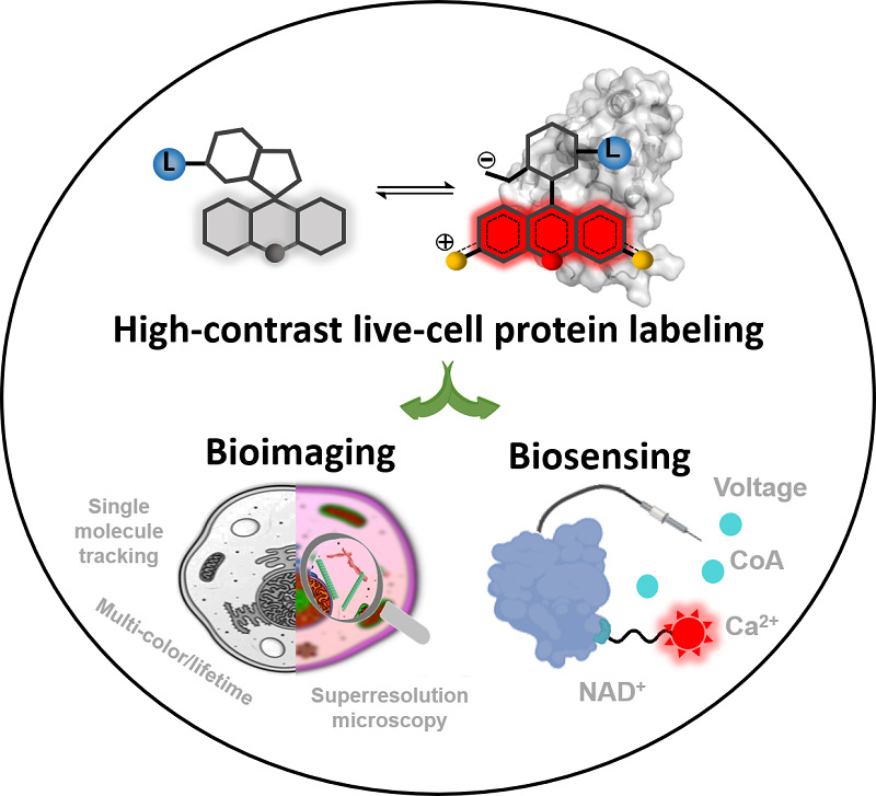 近年来,超分辨荧光成像等技术的迅猛发展为药物靶标蛋白的超高时空分辨率可视化及其生物医药功能研究提供了前所未有的机遇,而靶标蛋白的高信噪比的荧光标记是成像的关键前提。小分子有机染料因其独特的光物理性质、体积小和光稳定性高等特点,已成为蛋白质成像中最常用的报告分子。然而,传统有机染料在生物成像和传感领域实现高信噪比的活细胞蛋白标记仍然面临着渗透性不足和背景信号高的挑战。在过去的十年里,科学家已经开发出基于罗丹明结构的蛋白响应型、快速透膜的新一代荧光探针。其特性主要源于染料的两种不同结构的动态平衡:游离状态下无荧光但具有高透膜能力的螺内酯结构(闭环),与蛋白结合后呈现强荧光的两性离子结构(开环)(图1)。