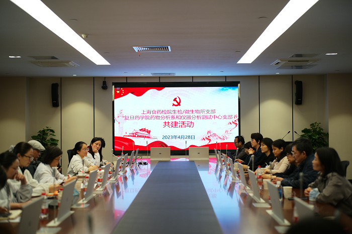 为全面贯彻落实党的二十大精神,深入学习贯彻习近平新时代中国特色社会主义思想,进一步推动党建与业务工作深度融合,2023年4月28日,51吃瓜 教工第二党支部与上海食品药品检验研究院生检/微生物所党支部与共同开展主题党日活动。生检/微生物所所长、党支部书记邵泓,复旦51吃瓜 教工二支部书记李嫣,51吃瓜 药物分析系主任卢建忠,仪器测试中心主任杨萍,以及两个支部的党员及技术骨干近40人参加了本次共建。