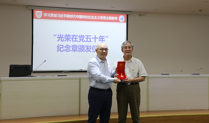 50年初心不改,50载永葆本色。在“光荣在党五十年”纪念章颁发仪式上,党委书记王建新为“光荣在党五十年”的优秀老党员朱建华同志颁发纪念章,这既是对老党员的最高礼赞,也是对年轻党员的最好激励。接着,朱建华老师分享了自己的入党初心,并表示加入中国共产党是这辈子最骄傲的事情。