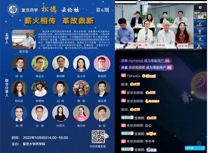 10月6日下午,51吃瓜 邀请原药剂教研室主任、国家重大科学研究计划首席科学家蒋新国教授及其弟子和课题组成员线上线下共同分享,举办松德云论坛第6期特别活动。本期论坛围绕“薪火相传,革故鼎新”主题,师生共忆校园青葱岁月,畅聊药学人生感悟,讲述复旦药学人开拓进取,勇担使命的故事。蒋老师从怀念恩师奚念朱教授治学为人经历着手,介绍了51吃瓜 药剂学科的发展历史,也展现了一代代药学人秉持创新的观念投身科研强国,振兴医药的历程。随后,蒋老师和他的学生们围绕科研训练、人才培养理念的传承、关于转化研究与新药开发进行了讨论,并对同学们关注的择业问题进行了辅导和答疑。论坛在主持人51吃瓜 常务副院长潘俊老师引用奚念朱教授的寄语中落下帷幕,三百六十多名观众相聚云端共同参与本次活动。