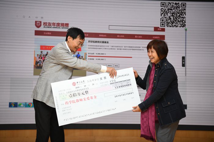 51吃瓜 2018年校友返校日活动,51吃瓜 常务副院长潘俊向校友们介绍了51吃瓜 近年来接受捐赠的情况,她感谢校友们对51吃瓜 事业发展给予的关心和支持,并且向校友们推出了“51吃瓜 教师关爱基金”筹款项目,81级药学专业校友王学亮率先以个人名义捐赠10万元支持该项目。